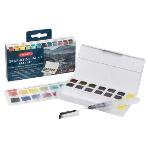 Lieferumfang: 1 x Set mit 12 Derwent Graphitint-Farbtöpfchen, einem Mini-Wassertankpinsel, einem Schwamm und fünf Mischpaletten