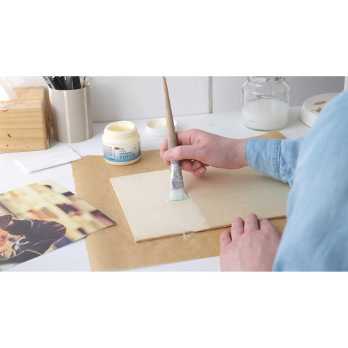 Ausdrucke und Kopien aus dem Laserdrucker, Zeitungsausschnitte und Zeitschriftenbilder werden mit dem Foto Transfer Potch auf den Untergrund übertragen und anschliessend mit dem KREUL Foto Transfer Potch Überzugslack überlackiert