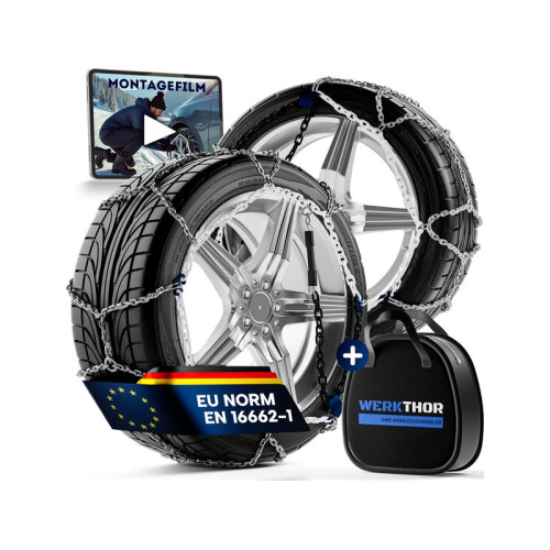 Die WERKTHOR Schneeketten überzeugen durch geprüfte Qualität: Sie sind TÜV-geprüft und nach ÖNORM V 5117 zertifiziert, wodurch sie in der gesamten EU sicher einsetzbar sind. Sie bieten optimale Stabilität bei winterlichen Strassenverhältnissen, verringern die Rutschgefahr und sorgen für maximale Kontrolle auf Schnee und Eis. Die Montage gelingt schnell und werkzeuglos ideal auch für ungeübte Fahrer, die die Ketten in wenigen Minuten sicher anbringen möchten. Dank der kompakten Aufbewahrungstasche lassen sich die Schneeketten platzsparend im Kofferraum verstauen und sind im Notfall sofort griffbereit.