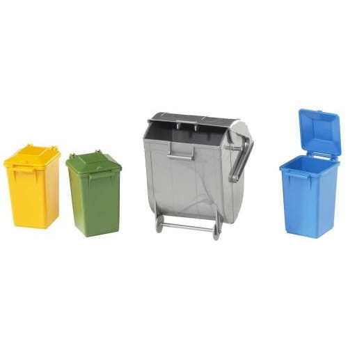 Die vier Mülltonnen sind originalgetreue Nachbildungen und sehen somit genauso wie Tonnen der Müllabfuhr aus. Neben der grossen Mülltonne, welche beispielsweise für Altpapier genutzt werden kann, beinhaltet das Set zudem drei kleinere Mülltonnen für Entsorgungen von Essensresten, Kunststoffen oder Metall. Das Mülltonnen-Set ist zudem für die Müll-LKWs von Bruder geeignet und dient somit als optimale Spielerweiterung.